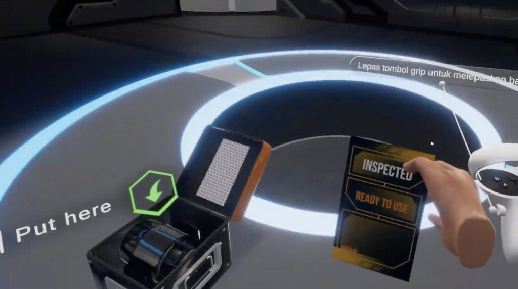 3. Holographic UI Mastery Modern industrial operators must be adept at handling digital control panels. The onboarding module familiarizes trainees with floating holographic menus. Users practice pointing, using the trigger to select, and scrolling through equipment lists using natural wrist gestures. This digital dexterity translates directly to critical actions in later modules, such as interacting with virtual control boards or selecting the proper fire extinguisher.