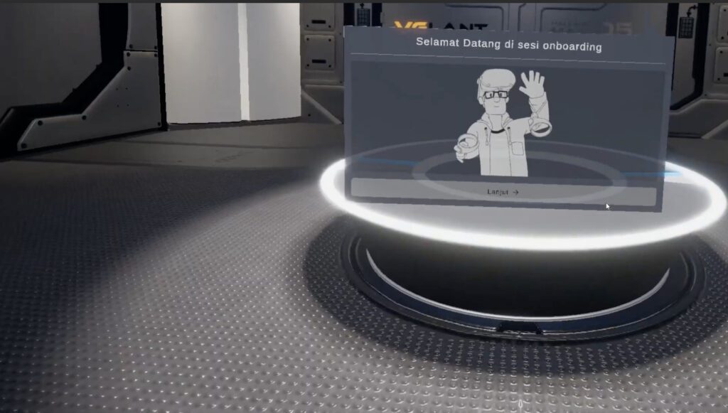 2. Interactive AI Guidance Trainees are never left to navigate the digital world blindly. Upon entering, they are introduced to Virginia Turner, the interactive VGLANT Onboarding Assistant. Approaching her designated interaction zone triggers verbal instructions and localized context. This NPC (Non-Player Character) adds a helpful, human-centric element to the high-tech space, ensuring users always know their next objective.